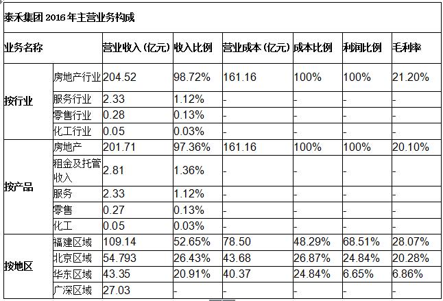 房地产业务一直是泰禾的核心业务。年报显示,作为泰禾核心业务的房地产板块,2016年实现营业收入201.71亿元,结转面积118.36万平方米,其中住宅地产实现销售收入137.61亿元,结转面积91.94万平方米;商业地产实现销售收入64.10亿元,结转面积26.42万平方米。