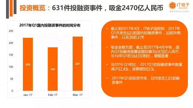 ①2017 年 Q1 共发生 631 件投融资事件,吸金 2470 亿人民币,与 2016 Q1 相比,2017Q1 的投融资事件数量减少 57.4%,金额增加 51%;