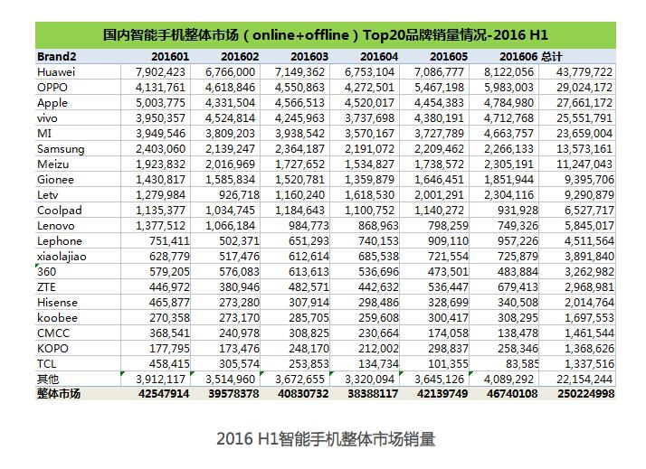市场研究公司赛诺(Sino)曾发布过一份2016年上半年中国智能手机Top20品牌销量报告,当时的数据显示,当时国内销量排名前20的手机厂商分别是:华为、OPPO、APPLE、vivo、小米、三星、魅族、金立、乐视、酷派、联想、联想lephone、小辣椒、360、中兴。