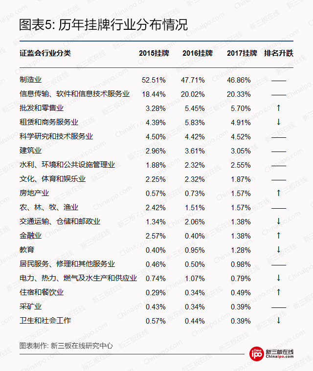 根据上表数据统计,我们发现虽然2017年挂牌速度有所降低,但是行业分布大体上保持着相对稳定。
