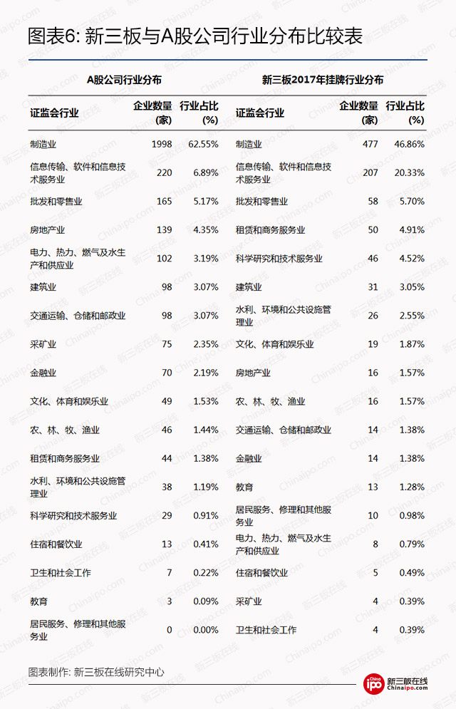 为了分析A股和新三板行业构成情况,新三板在线研究中心对两个市场的行业分类进行了统计。