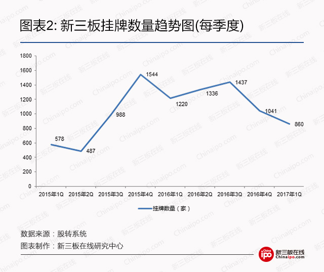 但是随着进入2017年,企业挂牌数量明显降低,截至2017年Q1新三板挂牌企业仅860家,同比减少了29.51%,同时也是2015年Q4以来首次季度跌破一千家的挂牌数量。