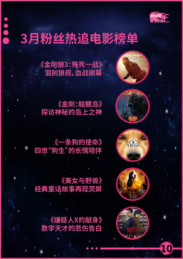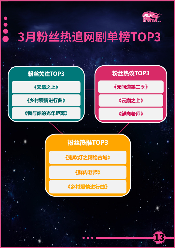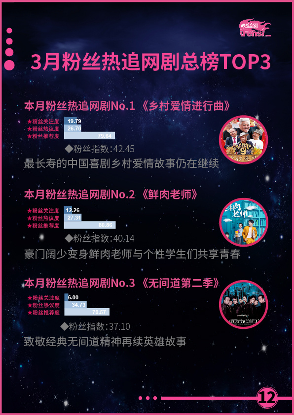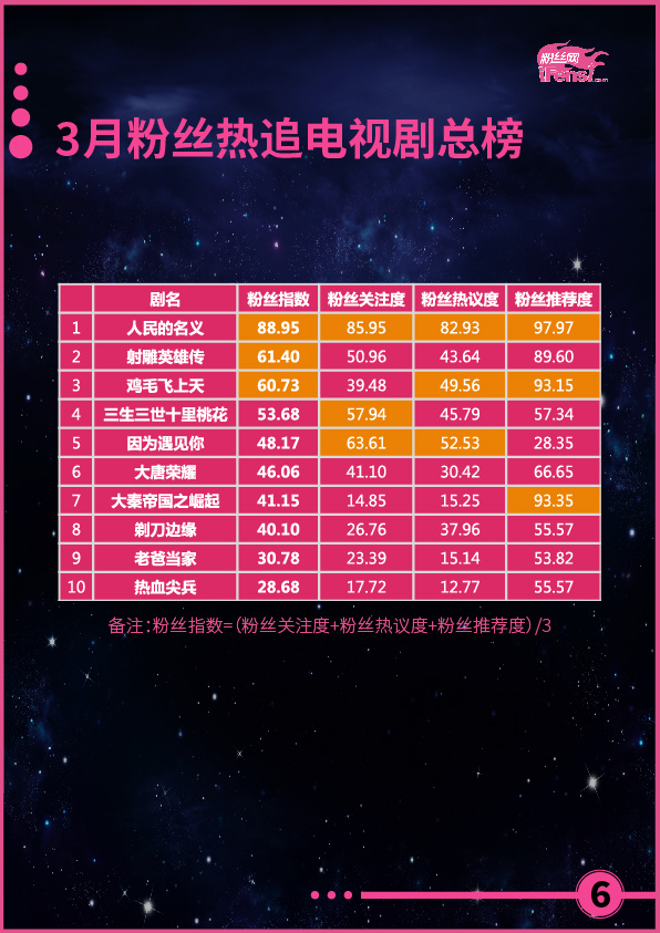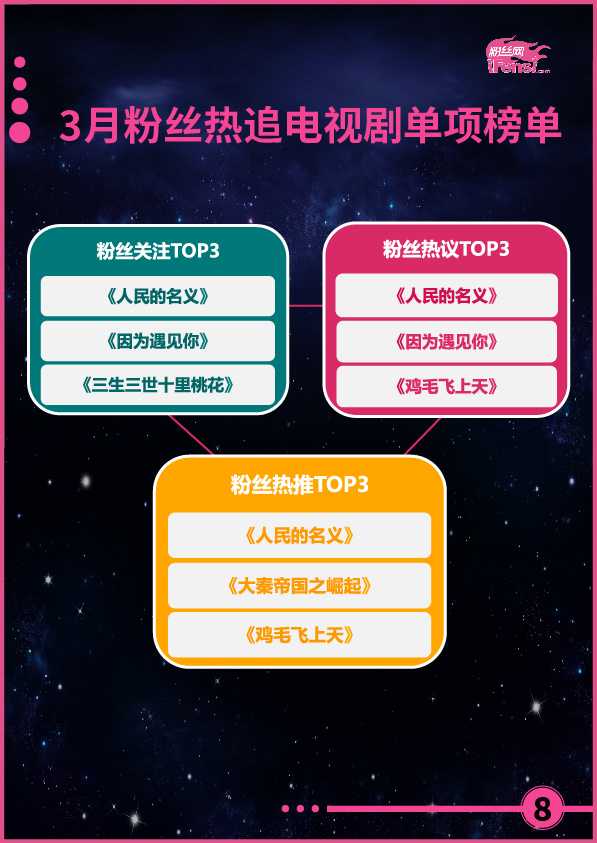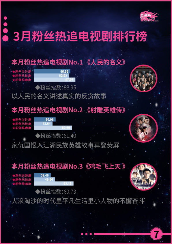 本月,《人民的名义》和《鸡毛飞上天》等作品,以黑马之势,在古装、玄幻剧纵横的电视剧市场中占据了重要分量,尤其是《人民的名义》,直接接棒《三生三世十里桃花》,成为开年第二部现象级大作,且作品播出时间较短,热度攀升速度快,潜力巨大,有望再创近半年来电视剧作品成绩的新高。相比之下,网剧市场和电影市场则表现较弱,没有高品质网剧引粉丝热追,电影票房也再次弥漫了去年的颓势,两个模块亟待优质佳作的出现,以改变现状,提高粉丝指数。
