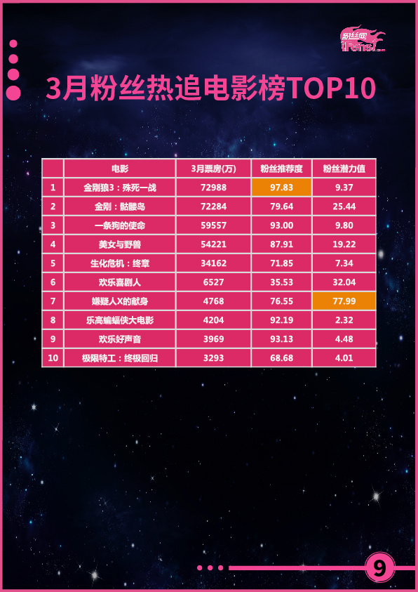 《金刚狼3:殊死一战》作为整个系列的完结之作,承载了众多粉丝的期待,上映当日就取得了破亿票房,粉丝泪别狼叔,7亿票房获本月粉丝热追电影排行榜第一。