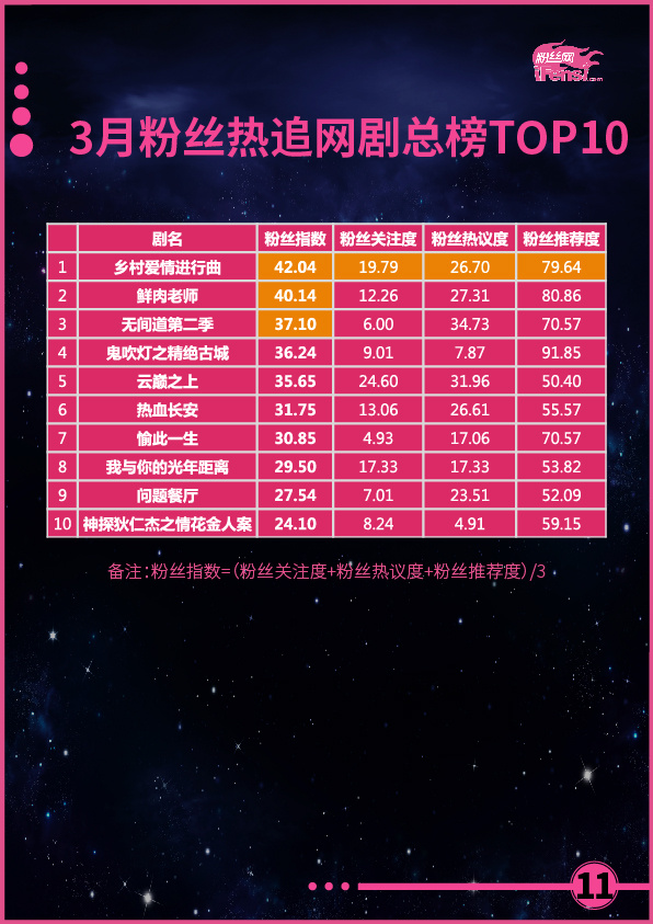 粉丝热追电视剧模块的成绩持续增长,上月在《三生三世十里桃花》的带领下,粉丝热追电视剧作品的成绩表现出明显进步,更是创造了近半年来电视剧作品的最高成绩,而本月表现也毫不逊色。