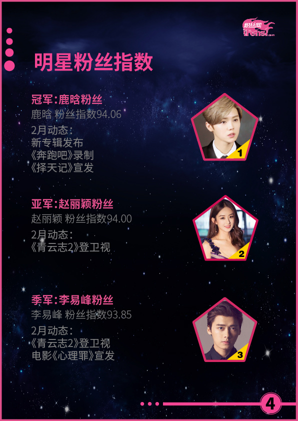 明星粉丝指数榜TOP3:鹿晗、赵丽颖、李易峰