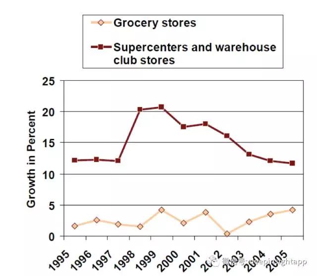 由于传统的超市并没有任何用户忠诚度,而且人口结构变化导致外出就餐比例提高。所以整个超市在90年代的收入增速在5%以内,而相反沃尔玛,Costco这种大超市的增速在15%左右。如果我们剔除掉通胀因素,其实那个阶段美国超市的增速还不及美国人口增长的速度。