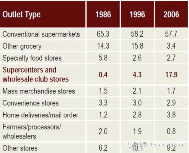 首先我们看到1986到2006的20年时间,美国人生鲜购物最大的变化就是超级大超市,批发式的会员俱乐部占比大幅提高。其中两个最有代表的公司就是沃尔玛和Costco。他们的占比从1986年的0.4%提高到了2006年的17.9%。如果再看最近十年这个比例还是继续提高。