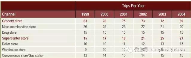 我们再来看一个数据统计,1999到2004年之间,美国人去传统超市的数量从一年83次下降到了69次。相对应的是,他们去超市中心店的数量从一年15次增加到了27次。另外在增加的是去0.99美元这种廉价店次数和去便利店购买的次数在增加。但是美国和亚洲不同,其实去便利店数量还是很少,因为大部分人开车,而且家里附近也有一些Grocery Store。所以7-11这种在美国其实并不成功。
