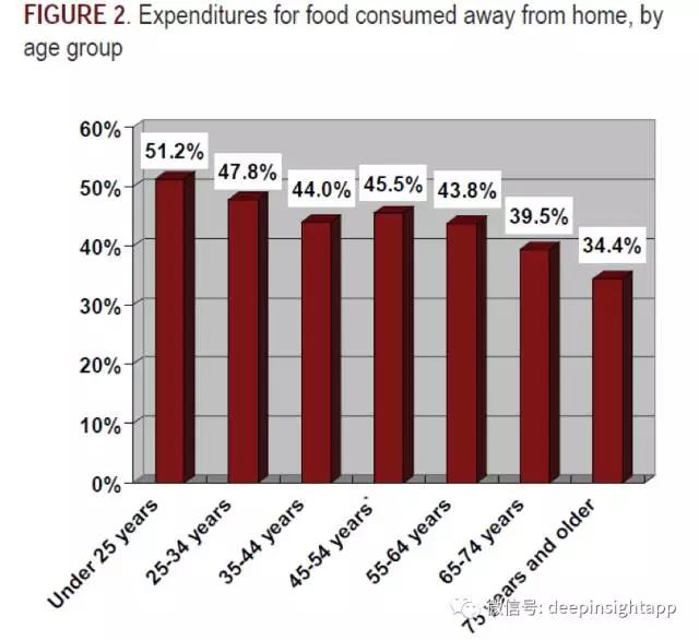 我们从年龄结构来看。2006年时,25岁以下美国人有一半的食物开支是在外面吃饭。年纪越小,外出就餐的占比就越高,这点和中国的今天也是类似的。