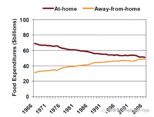 婴儿潮的成长,也带来了饮食方式的改变。一个非常大的变化就是越来越多美国人开始在外就餐。这个特点和今天的中国婴儿潮类似。从1966到2006的四十年时间,外出就餐比例已经开始接近在家就餐的比例。这也对“食物”的渠道带来了巨大变革。传统的超市价值越来越低。