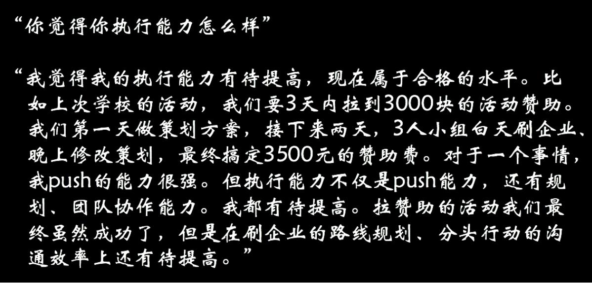 如果问你第一个问题“你觉得你的执行能力怎么样?”,一定要举出具体事例来佐证。你回答“我觉得我执行能力还不错”这样的话,等于什么也没说。