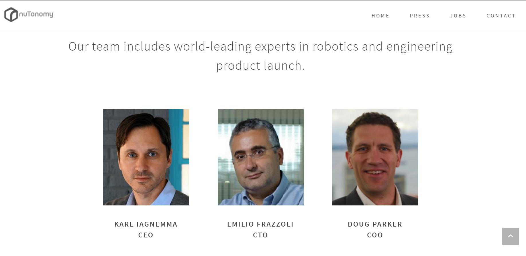 NuTonomy是一家从麻省理工学院(MIT)走出的教授和学生成立的创业公司。Karl Iagnemma担任NuTonomy的CEO,在创办NuTonomy之前,他是MIT机器人移动集团的主管,发表过150多篇相关技术论文,对于自动驾驶技术的研究已经超过10年。Emilio Frazzoli是NuTonomy的CTO,此前是MIT航空航天工程系的全职教授,官方介绍他是“全球知名的机器人、车队管理及自动驾驶领域的专家”,在机器人、自动驾驶和无人机领域发表了200多篇论文。