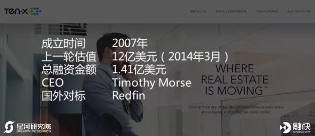 Ten-X的前身是Auction.com,采用竞价的方式对房产进行在线销售。目前拥有三条业务线:Ten-XCommercial主要通过竞价的方式对商业地产进行买卖;Auction.com主要对普通住宅进行竞价交易;Ten-X Homes是2016年3月新上线的交易平台,主要为个人消费者提供能快速入住的住宅服务,可以允许房主、房产代理和房屋经纪人在线挂牌进行销售和购买。