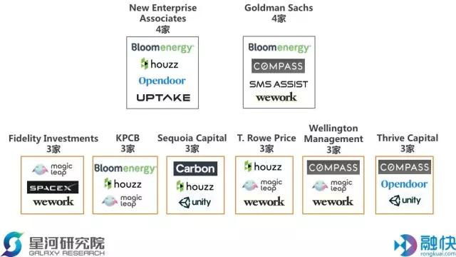 2、NEA和高盛成为该领域投资独角兽最多的机构。WeWork和MagicLeap则成为最受欢迎的独角兽。
