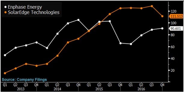 SolarEdge 和 Enphase 两家微型太阳能逆变器季度销售对比图(单位:百万美元)