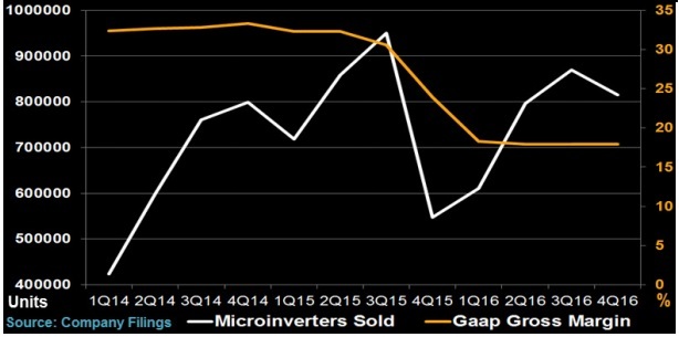 事实上,Enphase 公司的最大竞争对手是 SolarEdge, 后者为了进一步扩大市场份额,其 2016 年平均销售价格预计会下滑 10-15%。根据 Enphase 公司的计划,他们会在 2018 年一季度推出低成本的第七代产品,此举可能会有助于减缓其中期价格持续下滑的趋势。