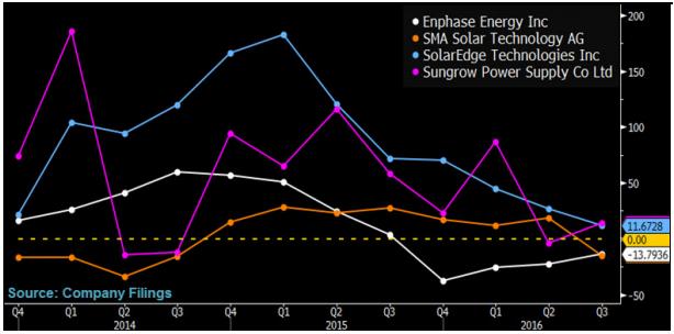 Enphase 曾是全球微型太阳能逆变器行业的“霸主”,2016 年,该公司进行了战略转型,在本月推出自己第六代微型太阳能逆变器(IQ6)之前,为了提升产品销量,他们对产品售价进行了调整,降低了价格,但这可能会影响利润率。不过,随着老库存产品被销售殆尽,Enphase 公司开始全面发货自己的第六代产品 IQ6 之后,这款全新微型太阳能逆变器产品的利润可能会在 2017 年二季度有所上升。Enphase 公司还在自己的最新产品 IQ6 上整合了 AC 模块,为其提供 AC 模块支持的厂商都是业界顶级供应商,包括 JinkoSolar, Solarworld 和 LG。目前,市场上 Enphase 公司最大的竞争对手是 SunPower,旗下自主生产的微型太阳能逆变器就整合了 X 系列 AC 电极板,市场份额也在不断增长。不过,当 Enphase 公司的第六代微型太阳能逆变器产品上市之后,可能会对 SunPower 的增长势头有一定遏制。
