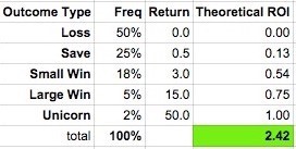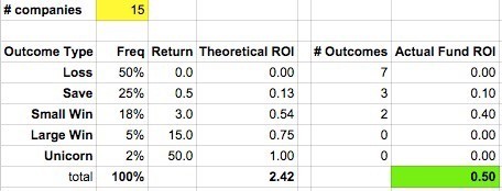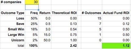 这个模型令人非常清楚的是,回报是基于在投资组合中发生的独角兽(也可能是半人马)的成功概率。如果投资组合的规模太小,就有可能找不到赢家。