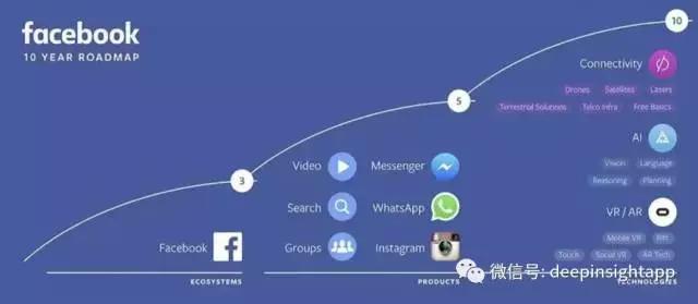 过去几年Facebook对于未来的重心一直在虚拟现实。之前看过一段扎克伯格的访谈,大意是“互联网最早的交互是文字,然后有了照片,今天已经进入了在线视频的时代。照片所能表达的内容比文字更丰富,视频比照片更多,但这一切不是结束。后面还有虚拟现实。你可以瞬间知道对方想什么”。从产品线的角度看,Facebook的生态将围绕着效率更高的交互方式。移动互联网已经完成了交互时间大幅延长,从过去几个小时变成了24小时在线。