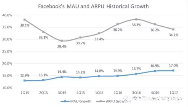 Facebook第一季度营收为80.32亿美元,比去年同期的53.82亿美元增长49%,不计入汇率变动的影响为同比增长50%;净利润为30.64亿美元,比去年同期的净利润17.38亿美元增长76%。2017年3月,Facebook每日活跃用户人数平均值为12.8亿人,比去年同期增长18%;月度活跃用户人数为19.4亿人,比去年同期增长17%;在第一季度,Facebook移动广告营收在总广告营收中所占比例约为85%,移动广告收入同比增长58%,达到了67亿。
