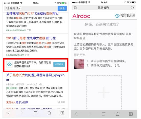近日,医疗人工智能公司Airdoc联手协和皮肤病医院与搜狗搜索,在搜狗搜索中上线了黑色素瘤人工智能识别服务。