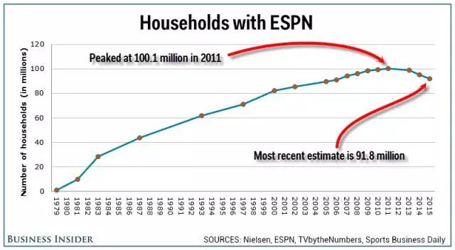 本世纪的前十年是ESPN的上升期,各种直播和栏目火的一塌糊涂。2011年ESPN的用户在全美超过了一个亿,把体育有线电视完全打造成了一个屌丝逆袭的神话。要知道,全美国一共只有一亿三千万的电视观众,这将近90%的渗透率已经把有线电视盒传统的无线电视受众拉平了。