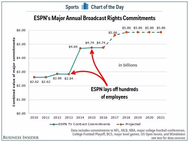 这笔收入看起来虽然不少,但2017年,ESPN将要支付给职业体育联盟的就超过80亿美金,包括NFL的19亿,NBA的14亿,MLB的7个亿,还有大学橄榄球季后赛的6个亿。其他的各个大学橄榄球联盟比赛,网球,高尔夫,各种天价版权数不胜数,完全没有给ESPN任何喘息的机会。
