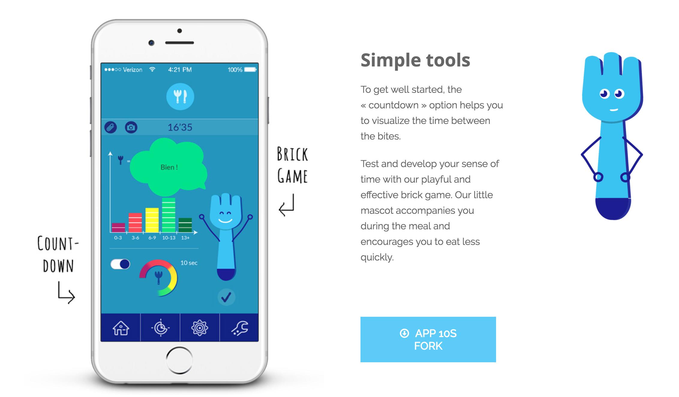 这款叉子的基本功能是:HapiFork会自动检测用户吃饭的速度,并通过“震动提醒”和“闪灯提醒”在吃得太快时提醒用户。