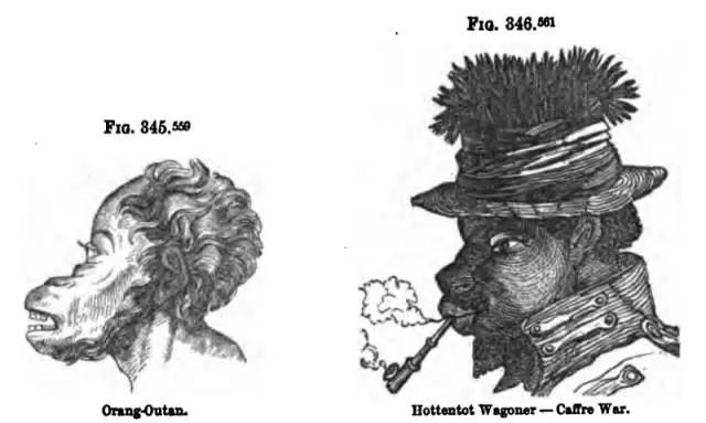图7.人类的劣势类型的观念和一些人比其他人更像动物这样科学上无效的想法相关。来自Nott 和Gliddon,《1854年的人类类型》。