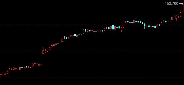 苹果的股价盘中最高至153.70美元。据苹果最新季报,其流通股总量为52.14亿股,这意味着股价达到153.44美元市值即可超过8000亿大关。