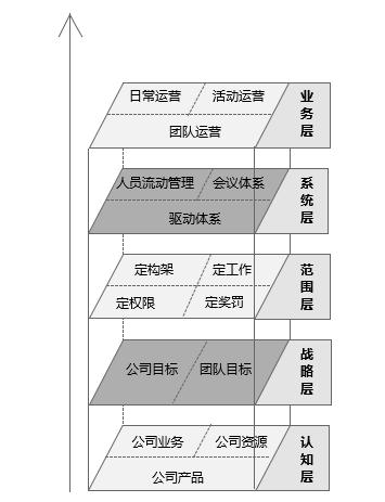 我们所做的一切工作都是围绕战略层的目标来进行的,那么日常运营工作也不例外,所以在此又延伸了两个层面的工作,分别为:以公司目标为导向的日常运营、以团队为目标的日常运营。
