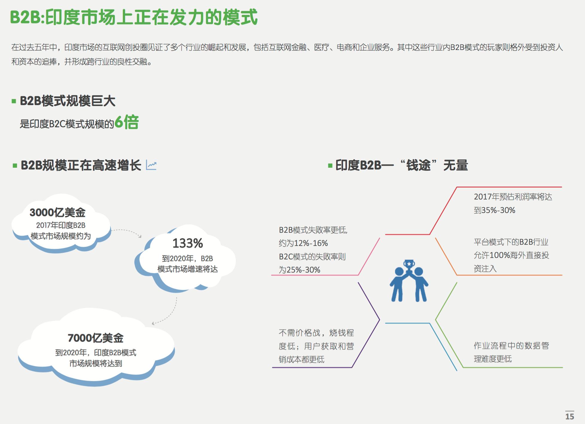 相比较B2C行业,B2B行业具有B2B模式失败率更低(约为12%-16%)、不需价格战,烧钱程度低(不烧钱在印度市场难能可贵)、利润率更高(2017年预估利润率将达到35%-30%)、作业流程中的数据管理难度更低等优势。