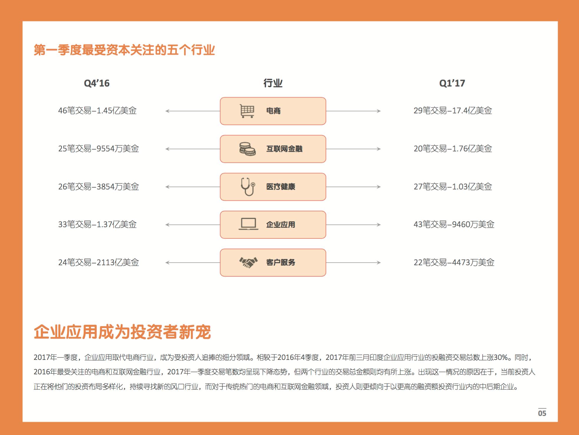 2017年一季度,企业应用取代电商行业,成为受投资人追捧的细分领域。相较于2016年4季度,2017年前三月印度企业应用行业的投融资交易总数上涨30%。
