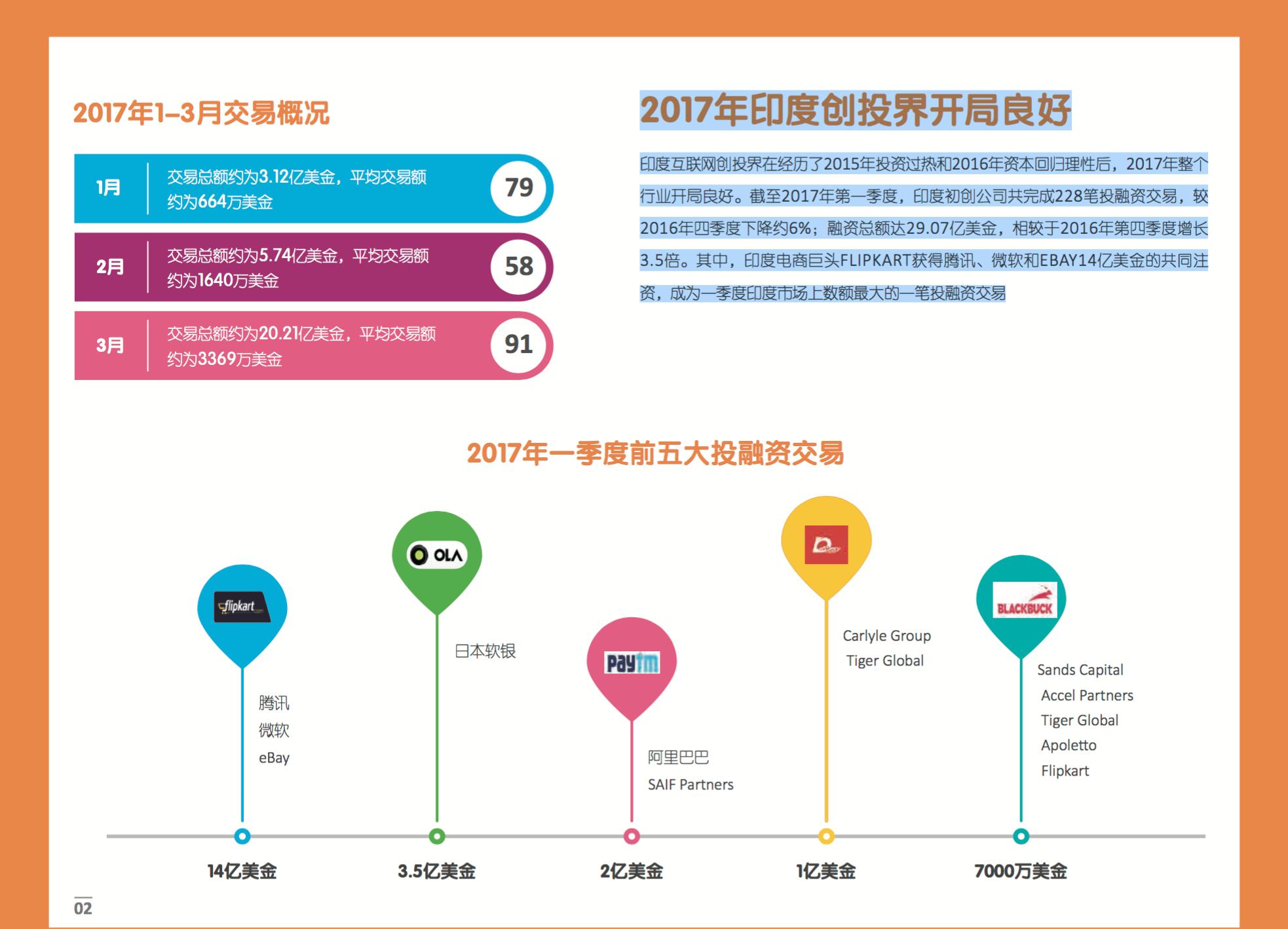 报告从投融资交易分析、收并购信息、活跃资本及投资人、政策变化、企业人事变动、创投趋势前瞻及中印投融资比较等维度进行解读,帮助大家对过去三个月的印度创投市场有个全面的了解。