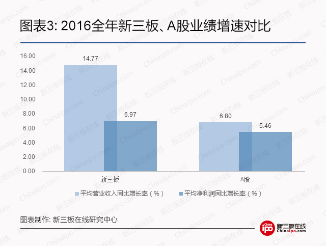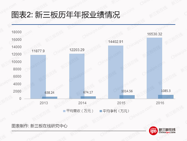 据东方财富Choice数据终端统计,2016年新三板10575家已披露年报的挂牌企业实现平均营收约为1.65亿元,较上年同期增长14.77%;平均净利润约为1,085.30万元,较上年同期增长6.97%。与A股对比可见,A股企业整体业绩表现平稳,而新三板企业平均营收、净利增长较可观。