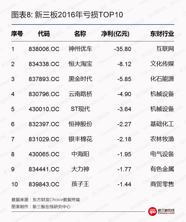 净亏损方面,2016年度亏损额超过5亿元的有3家,分别为神州优车、恒大淘宝、黑金时代。神州优车较2015年由盈转亏,于2016年亏损35.80亿元,居新三板亏损榜榜首。而2016年第二大亏损的恒大淘宝则为2015年的亏损榜首。
