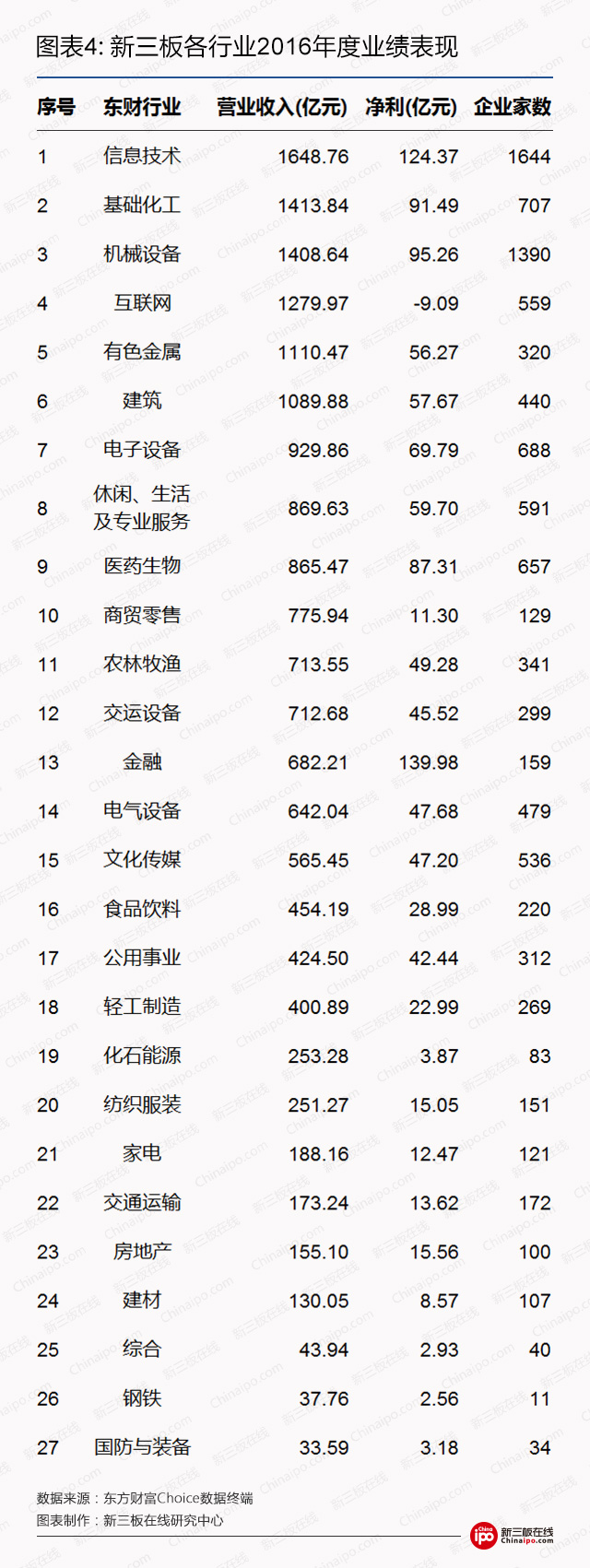 2、行业方面,信息技术行业整体营收规模最大,实现1648.76亿元,超越机械设备排第一位;2016年营收增速最高的为互联网行业,为66%,然而其整体净利却由盈转亏,净利下滑189%。
