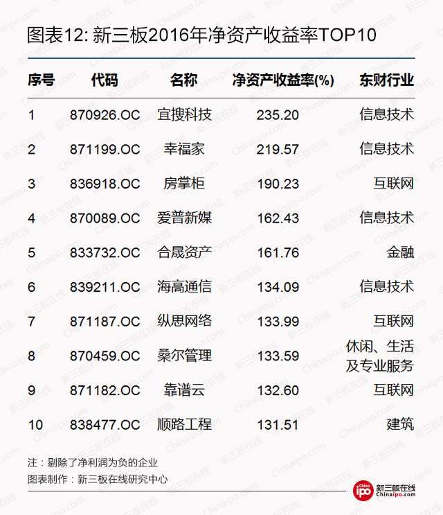 新三板在线研究中心统计,新三板上共有30家企业ROE(加权)超过100%,其中宜搜科技以235.20%的净资产收益率高居榜首。而榜单中,以信息技术、互联网行业企业居多。