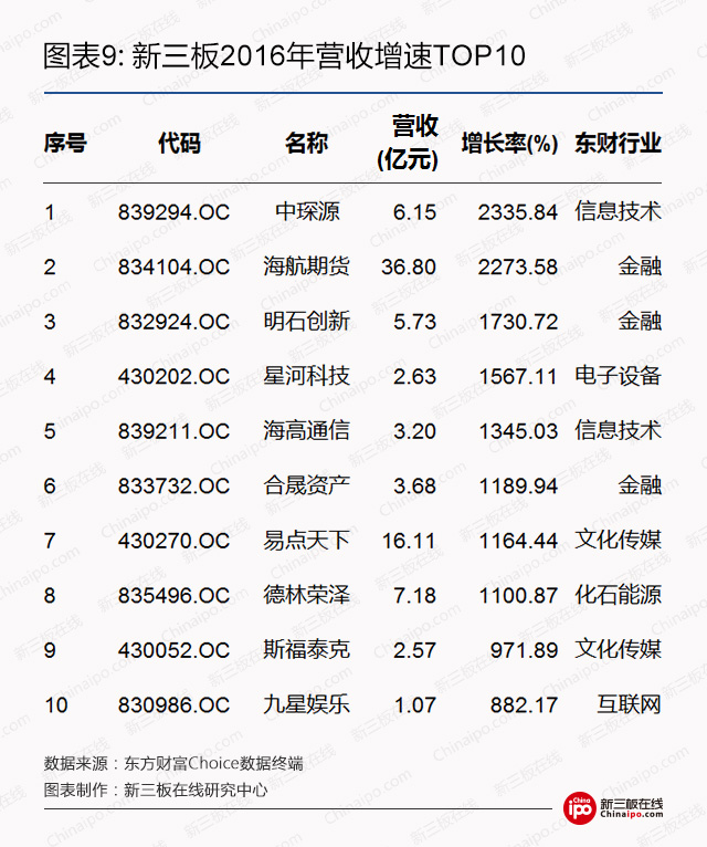 营收增速方面,于2016年实现营收增速10倍以上的有8家企业,分别为中琛源、海航期货、明石创新、星河科技、海高通信、合晟资产、易点天下、德林荣泽。其中,专注后向流量和语音的中琛源,2016年营收增长逾23倍,成为2016年营收增速最大的挂牌企业。