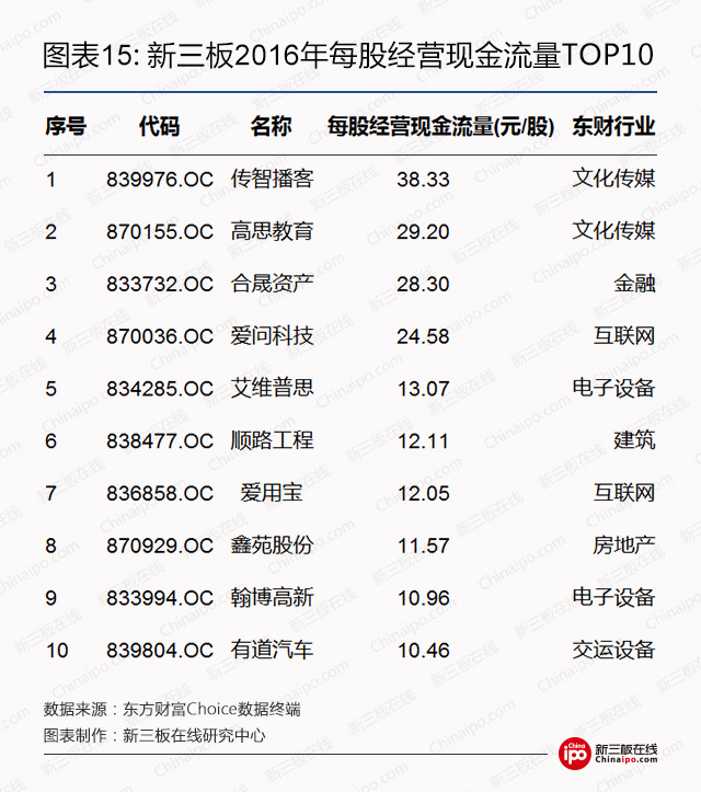 在现金流充沛程度方面,传智播客以38.33元/股的每股经营现金流量高居榜首。而每股经营现金流量超过10元/股的共有11家。