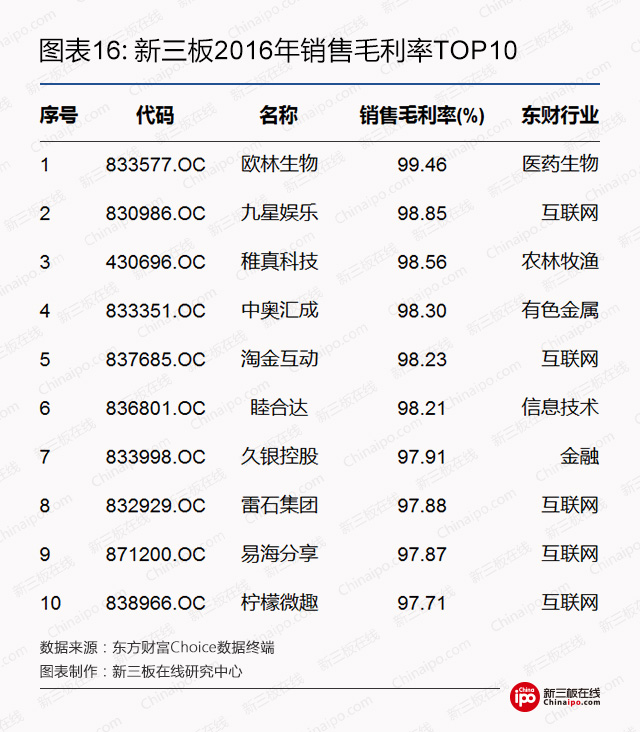 新三板在线研究中心统计,新三板上销售毛利率超过90%的企业数量高达80家,且以信息技术、互联网等行业居多。此外,医药生物行业的欧琳生物以99.46%的毛利率居于榜首。