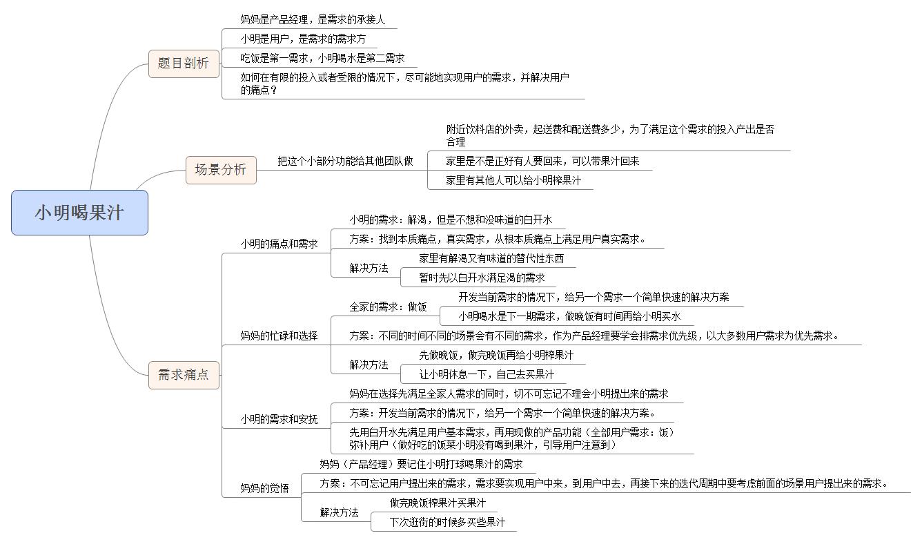 妈妈是产品经理,是需求的承接方,全家人是需求方,全家人是全部用户,全家人的第一需求是吃饭,小明是个别用户,喝果汁是第二需求,妈妈在有限的投入和受限情况下,如何尽可能的实现小明的需求,并解决小明的痛点?