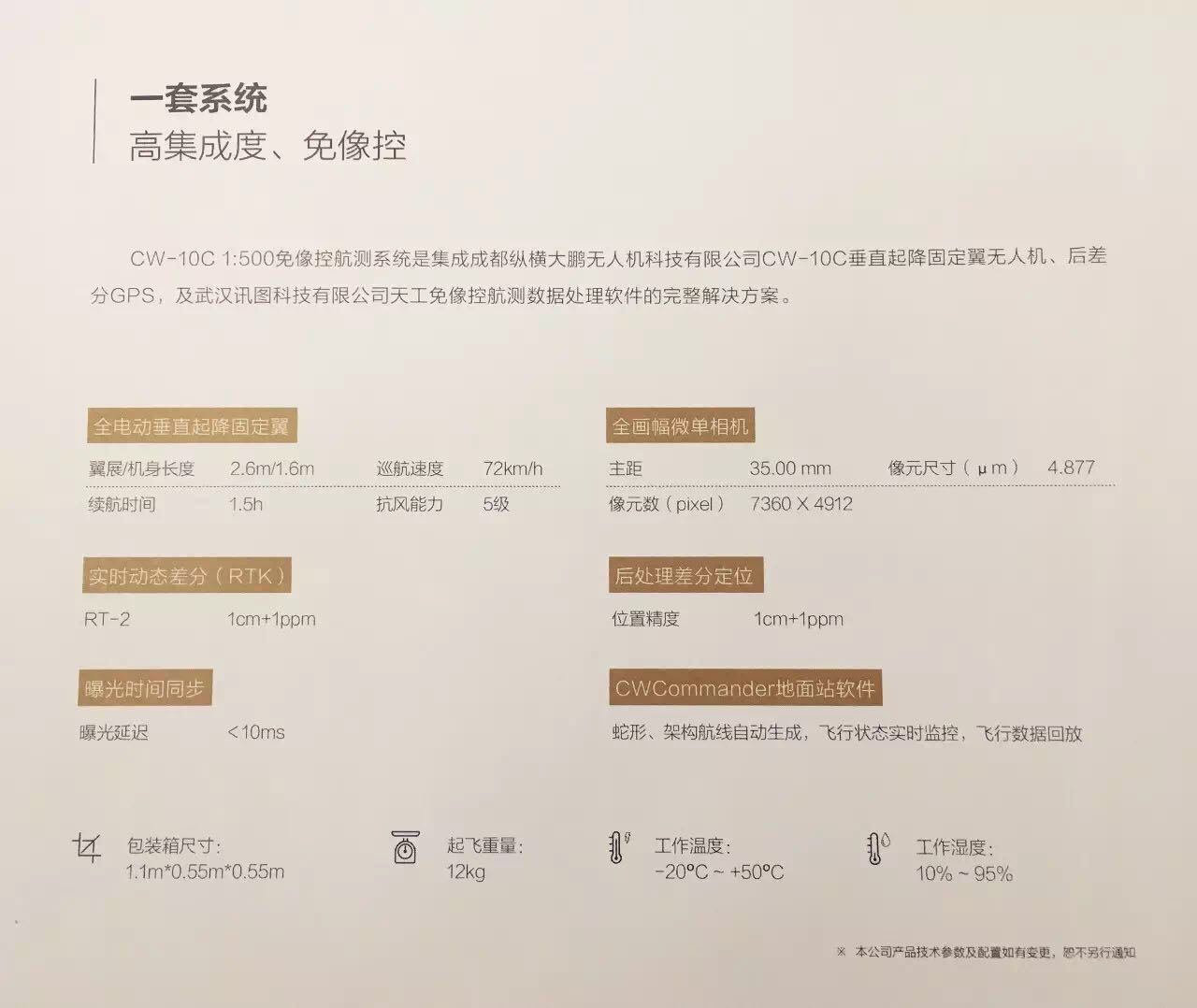 为了解决以上痛点,今天上午成都纵横大鹏无人机科技有限公司(以下简称“成都纵横”)和武汉讯图科技有限公司(以下简称“武汉讯图”)联合发布了新款“CW-10C 1:500免像控无人机航测系统”。该系统包括成都纵横负责研发的硬件设备平台和武汉讯图负责研发的软件平台,硬件设备主要用于外业数据采集,软件平台主要用于内业数据处理。