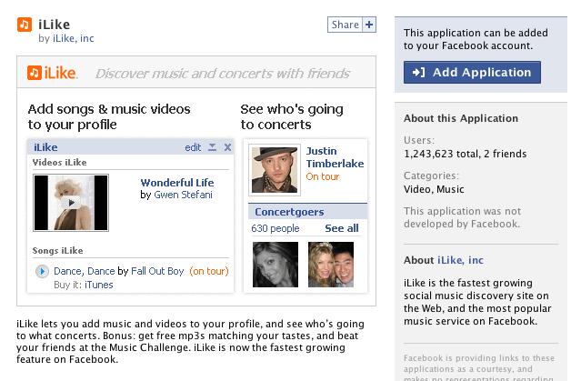 为什么扎克伯格会祭出如此激进的策略?首先,Facebook 毕竟业务有限,不像 Google 那样有搜索、 Youtube、Gmail、音乐等多条业务线,可以完全覆盖用户的网络行为。这导致 Facebook 在与 Google 竞争广告主时,会因为数据储备不足、难以给出清晰的用户画像而输掉竞争。有了外部应用,Facebook 就能在一定程度上缓解这一问题。当时最火的 Facebook 应用之一 iLike,就主打音乐分享功能。