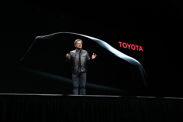 在现场,黄仁勋宣布英伟达正式与丰田公司展开合作,为其提供人工智能硬件及软件技术,丰田将采用NVIDIA DRIVE™ PX 人工智能汽车计算平台,双方致力于在未来几年内提升自动驾驶系统的性能并推进商业化进程。