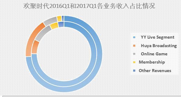 对比欢聚时代2016年Q1和2017年Q1各业务的收入占比情况发现,虎牙直播的收入占比不断上升,YY直播、在线游戏、会员增值服务还有其他收入占比均有所下降。