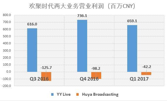 在各项业务中,在线流播营收为21亿元人民币(约3亿美元),同比增长52%,但环比有所下降;在线游戏营收为1.4亿元人民币(约合2030万美元),同比下滑18%;会员增值营收为4542万人民币(约660万美元),同比下滑34%;其它业务营收为人民币2436万元(约合354万美元),同比下滑52%。而在线流播业务中,YY直播收入(YY Live)为16.8亿元人民币,虎牙直播(Huya Broadasting)收入为3.8亿元人民币。