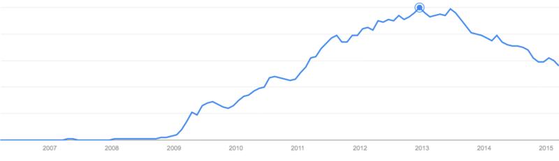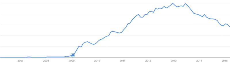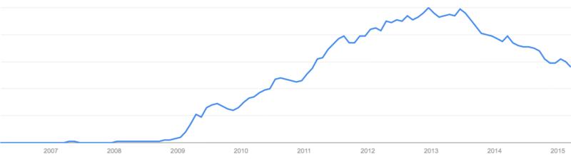 据上图显示,Twitter 在 2012 年 12 月点击率达到顶峰,之后便不断下滑,2015 年时,Twitter 已跌落至 2011 年初的水平。