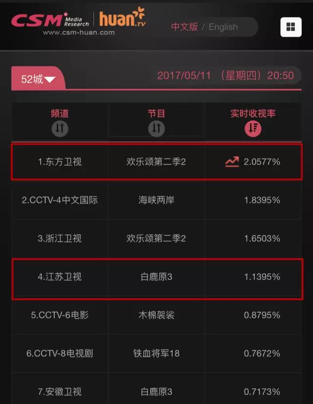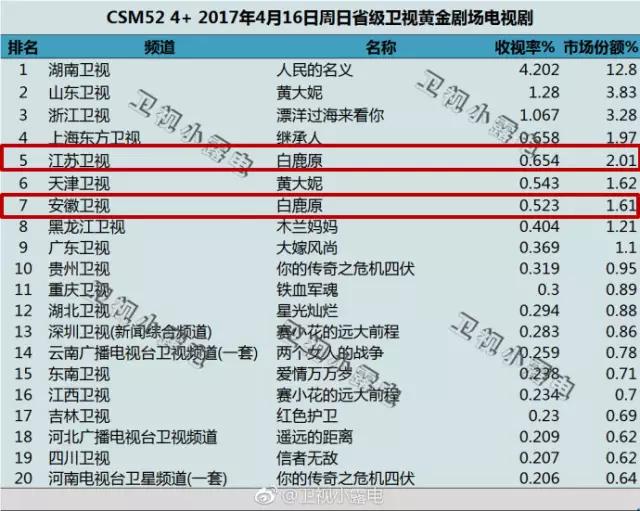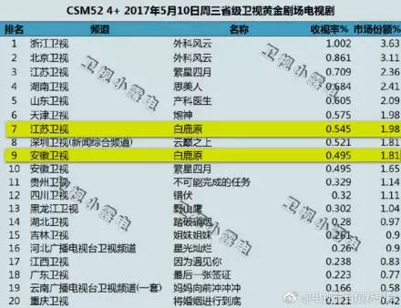 这么看来,前段时间的停播风波反倒有望助其收视提升。《白鹿原》5月10日如约在江苏、安徽卫视复播,其中江苏卫视还套播了《繁星四月》的大结局,想要引流收视的心不言而喻。但两平台的52城收视分别是0.545%(江苏)和0.495%(安徽),比22天前首播时最高时的0.654%(江苏)还要差。